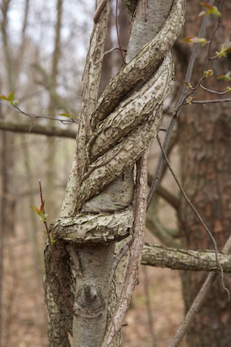 In June we reported how three invasive species—purple loosestrife, garlic mustard and Japanese bittersweet—were threatening the trees and grounds around the Finn Camp. The worst offender is probably the bittersweet, which you can see strangling a tree below.